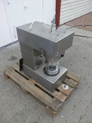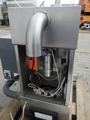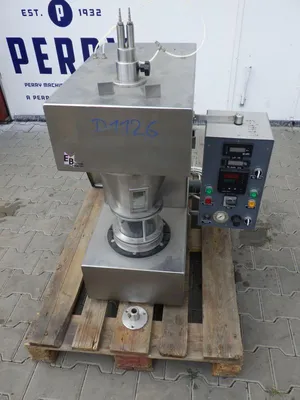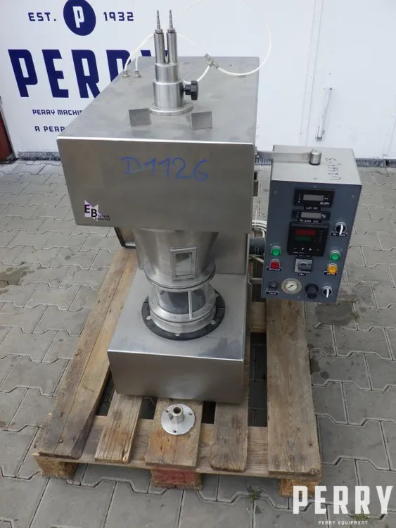 Used lab size batch type fluid bed dryer by EB Teknik Borup A/S (DK). Drying chamber has internal diameter 145 mm x length of side wall 115 mm. Total volume 1.9 l. Contact parts designed in stainless steel and glass. Has provision for two top spraying nozzles, but only one installed. Has local control panel.