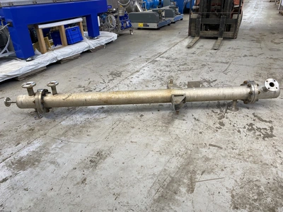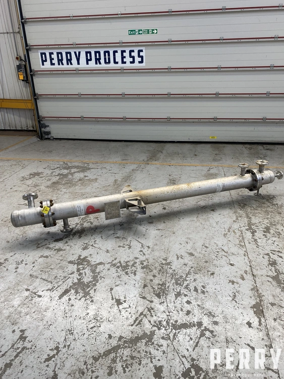 Used SRI BV approximately 3sqmt stainless steel vertical shell and tube heat exchanger. Has (27) 15mm inside diameter X 2,400mm long tubes 25 litre capacity rated -1.034/10 bar design pressure at 175 degC. 150mm diameter X 2,400mm long shell 26 litre capacity rated -1.034/10 bar design pressure at 175 degC. Unit has (2) bolted stainless steel heads. Mounted on (2) lugs. Last used as an beer column condenser.