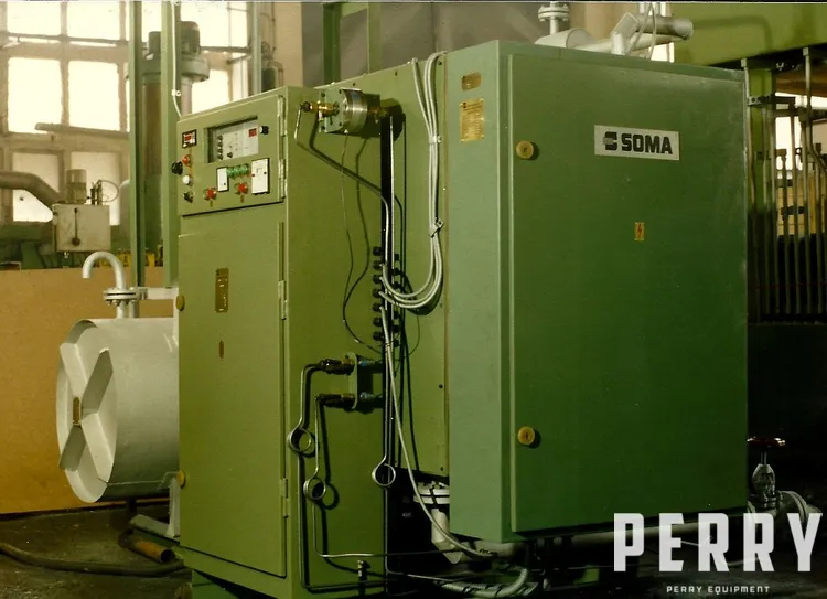 Used oil heating device by Soma (Poland) model AGEO-80. Machine has working output up to 80 000 Kcal/h. Working maximal temperature of oil up to 150 C. Working volume of heating tank 150 l. Heat receiver up to total volume (including piping) 1800 l. Unit has 20 electric heaters, each with power 5 kW, what gives total power 100 kW. Machine is equipped with circulation pump driven by 3 kW motor. Working output of pump up to 12 m3/h with pressure up to 3 bar. Shipping dimensions: L 2700 mm x W 1900 mm x H 3200 mm x weight 1600 kg. Machine had been working on heating moulds in hydraulic presses in furniture industry.