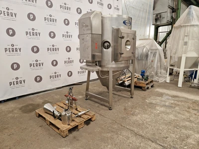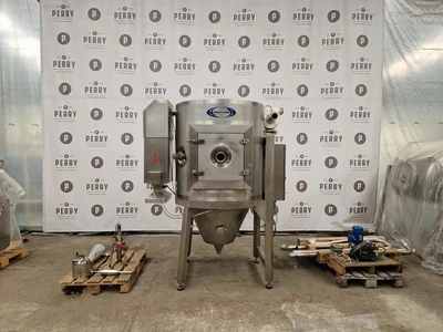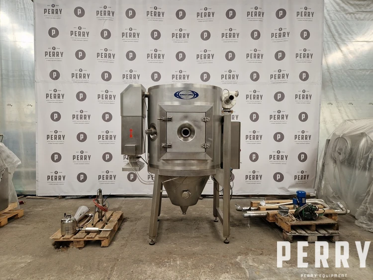 Used APV Anhydro model PSD 52 stainless steel (AISI 316) spray dryer. Unit rated 9,3 kh/hour water evaporation capacity at 350°C maximum air inlet temperature. Drying tower has diameter approx. 1000 mm x 700 mm height of straight side x 1100 mm conical height. Includes (1) rotary atomiser CMT model AF07 driven by 0.7 kW IBAG motor, diameter of wheel 63 mm, speed range 10.000 – 60.000 rpm. Unit also includes 12 kW electrical air heater, cyclone, fan and main switchboard with integrated control panel.