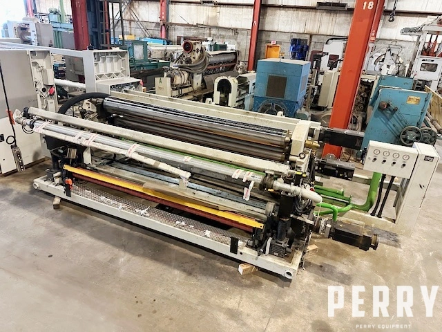 Also included are (3) different texture cast rolls, a heavy texture, light texture and double polish. Winder is 118″ finish width up to 32″ o.d. with 6″ core. Max roll weight for 3″ shaft approximately 1200 lbs. 6″ core has no weight limit, just 32″ diameter. Includes (3) 6″ cores, (4) 3″ shafts. Has blade holders for inline slitting up to 14 cut positions. Also included is cart and shaft puller.