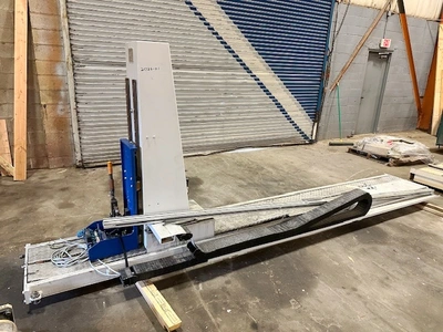 Has 300 meter maximum line speed, will accomodate 32″ maximum diameter rolls. Includes 3″ and 6″ shafts. Has flying knife cut-over, gap winding, electrostatic tapeless transfer, and slitting knives for up to (8) webs. Has Venturi trim removal system, auto roll removal system, winding shaft removal unit.