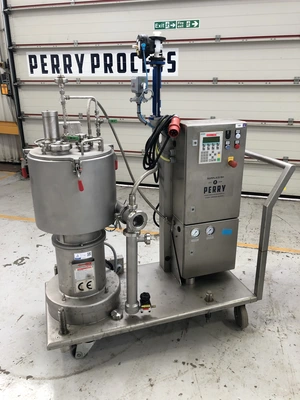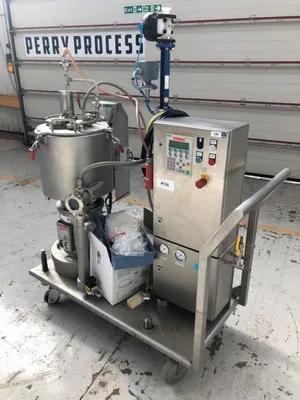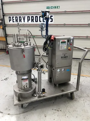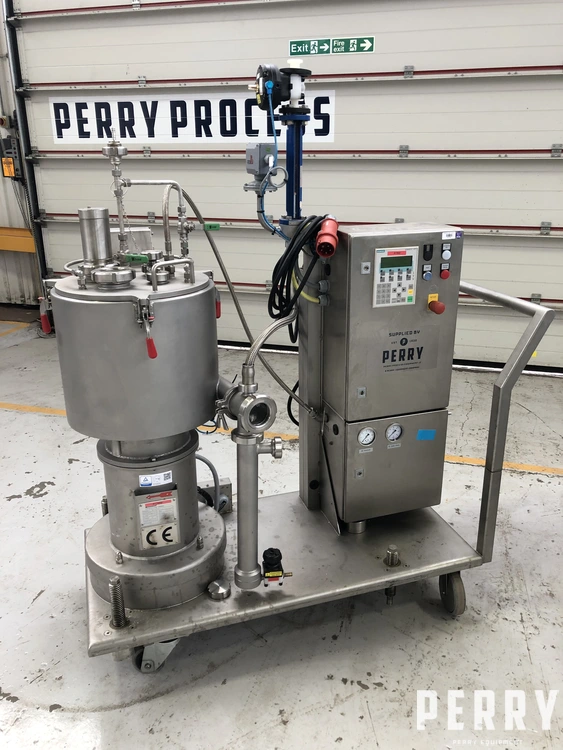 Used GFT Trenntechnik model V30 Hastelloy C22 contact parts vertical basket centrifuge. Basket measure approximately 300mm diameter x 150mm straight side. Approximate capacity 5 litre and 8kg useful load. Unit is top load and unload with filter bag discharge. Has quick release cover / lid. Unit is bottom driven with electric motor. Unit is mounted on mobile trolley.