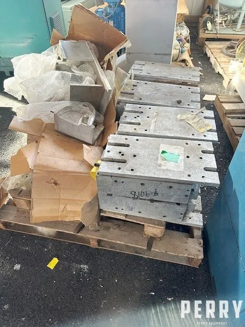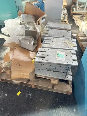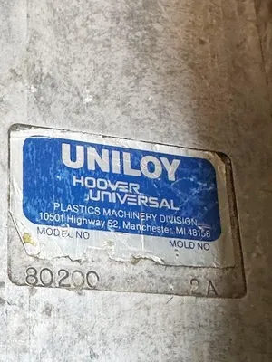 Used Uniloy #80200 128 ounce 4-cavity mold for oval handle bottle. Designed for use with 350R blow molder. Includes trim tooling. Part wt. 143 grams without flash. 38mm cap size.