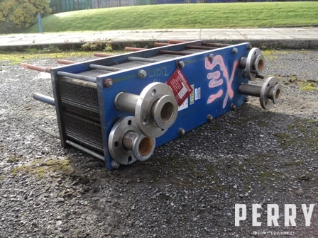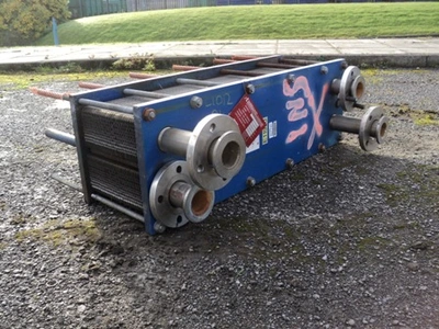 Used Barriquand stainless steel plate heat exchanger. Has (75) approximately 250mm wide X 950mm high stainless steel plates with approximately 13.1 square meter heat transfer area. Side A rated 5 bar maximum working pressure at 20°C maximum working temperature. Side B rated 5 bar maximum working pressure at 20°C maximum working temperature. Has (4) 50mm connections.
