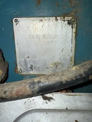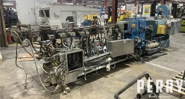 Used 58mm Coperion Co rotating Mega Compounder with 11 barrel sections (34/1 L/D) and side feeder, New 3/2002. Has electrically heated water cooled barrel. Direct connected to 500 hp DC motor with SCR controller. Has operator control panel with HMI touchscreen. Downstream includes Gala #7MUP underwater pelletizer including diverter valve, 450 gallon water tempering system, Gala spin dryer. Includes spare unused extruder gear box.