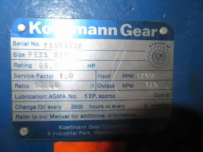 Gearbox: size PEZS 312, 19.95:1 reduction ratio, rated 88 hp, 1.0 service factor