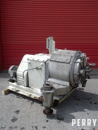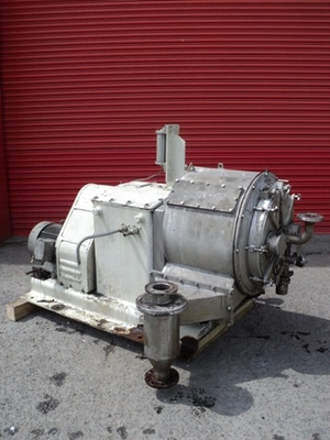 Used Krauss Maffei model SZ50-1-B-L 316TI stainless steel 2-stage pusher centrifuge. Has 1.4581 cast stainless steel basket. Feed pipe through front door. First stage is 431mm diameter X 125mm long. Second stage is 500mm diameter X 224mm long. Basket driven by 22 kW 500 volt 3/50 1455 rpm motor at 1400 rpm. Pusher driven by 7.5 kW 500 volt 3/50 2930 rpm motor. 1.4571 stainless steel housing. Maximum filling capacity 26 kg with maximum product density 1300 kg/cubic meter. Mounted on base.