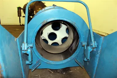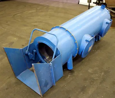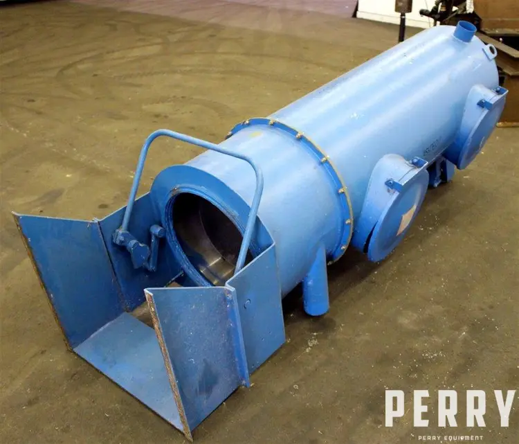Used Spencer 24″ diameter carbon steel tubular bag separator. Requires (10) bags approximately 53 square feet filter area. 4″ diameter inlet/outlet, (2) 16″ diameter side access door. 17.5″ bottom outlet. No dust collector can. Skirt mounted.