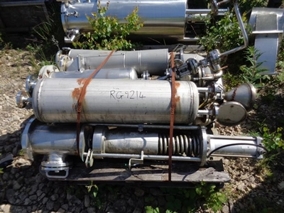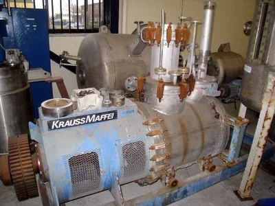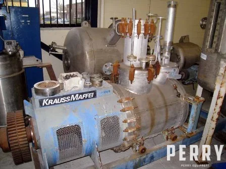 Used Krauss-Maffei model Discotherm B 160 B 160 litre (5,6ft3) stainless steel 316ti high speed pilot batch ‘list’ type Discotherm vacuum dryer blender system. Rated internal 3,1/-1 bar @ 250°C. Cored agitator shaft 9,0 bar @ 300°C. Stainless steel jacket body + both end plates 9,0 bar @ 300°C. Vessel body has clamp on / off flat ends. Body measures 600mm I/diameter X 754mm long. Unit complete with: interrupted spiral disc blade with lump breakers, blade and end scrapers, cored shaft for heating, geared tooth belt pulley, manual variable speed drive through a reduction gearbox, output 0 to 85rpm. Openings top: product inlet: 1 X 200mm, 300mm diameter flange for condenser. Offset bottom outlet: 125mm diameter with flush fitting plunger valve. Material thickness: body: 8,0mm. Jacket: 6,0mm unit supported by a 1,7M high carbon steel stand alone frame.