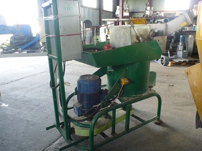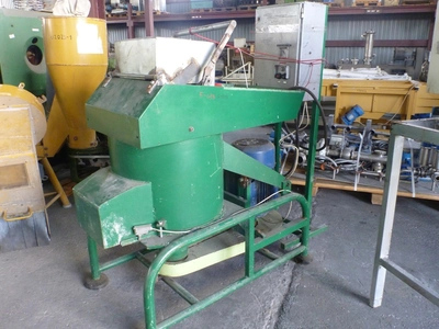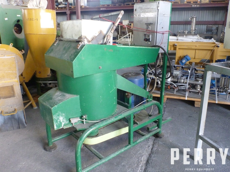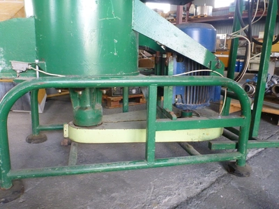 Used Polish made crusher. Has vertical chamber with bottom side discharge. Internal diameter 640 mm x depth 470 mm. Has two knives mounted on round rotor which is bottom belt driven by motor 18.5 kW, 2930 rpm, 380 V, 3/50 Hz. Machine is mounted on integrated frame. Includes electrical control panel.