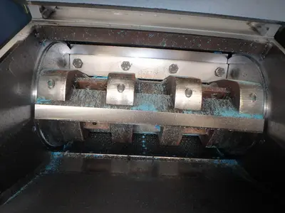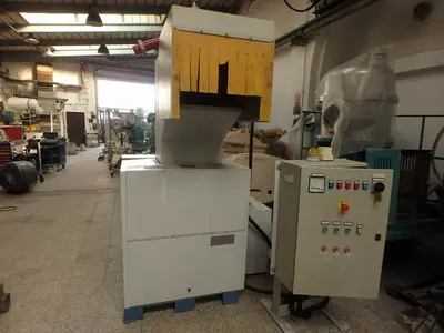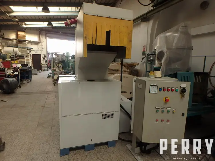 Used TRIA model 45-35/CN-SL horizontal cutting granulator. Rotor width 450mm, rotor diameter 350mm, open rotor, number of rotor knives: 3, number of stator knives: 2, cross cut. With hopper, hinged top, motor Siemens 18,5kW/21,3kW, 50Hz/60Hz, 400V/460V, 1465rpm/1765rpm. Inlet opening 460 x 430 mm. Forced discharge by ventilator and cyclone. Ventilator model PA400-SP. Mounted in sound absorbing box, with switchgear.