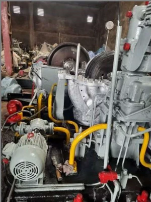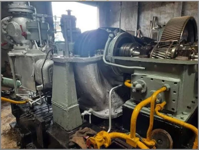 – Triveni (India) type 550mm back pressure steam turbine, new in 1988, with inlet steam pressure 21 kg/cm2 @ 340 Deg.C, and exhaust steam pressure 1/1.2 kg/cm2. With Triveni (India) gearbox, new in 1988, input speed 8250 rpm and output speed 1500 rpm, ratio 5.5/1. Turbine & Gear box alongwith coupling mounted on common baseframe (oil tank).