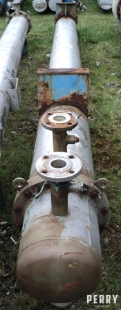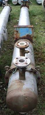 Used approximately 27 square meter stainless steel horizontal shell and tube heat exchanger. Has (114) approximately 16mm diameter X 4870mm long stainless steel tubes rated 5.9 bar design pressure. Approximately 350mm diameter X 4870mm long stainless steel shell rated 3.94 bar design pressure. Has bolted stainless steel heads 2-pass design. Mounted on (2) saddles.