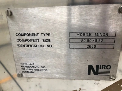 Perry is offering a high quality, used Niro Mobile Minor stainless steel spray dryer body. Niro is a leading manufacturer of drying equipment. This unit measures approximately 800mm diameter x 620mm straight side with 700mm long cone. Chamber lagged and clad. Unit includes electrical heater. Mounted on mobile base. Perry has been supplying this type of equipment for decades. You can rely on getting a first class service from the Perry Equipment Group.