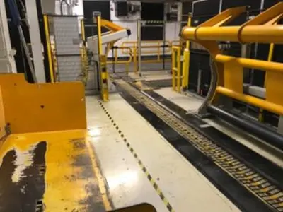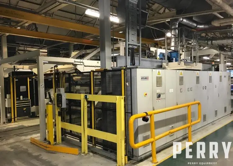 Used 110″ (2.8 m) wide Atlas TDW slitter-rewinder designed to slit paper grades between 80-200 GSM, tension 8 PLI, with the speed of 4900 feet/min (1500 m/min). Unwind maximum roll diameter is 59″ (1500 mm) max width is 110″ (2800 mm). Rewind maximum roll diameter is 72″ (1830 mm) max width 110″ (2800 mm). Normal running speed is 1000 RPM. Can slit up to seven webs across. Hydraulic pressure 155 bar, pneumatic pressure 6 bar. Rated to 415V, 315 A. PLC Controls Siemens S7. The unit was built in 2006.
