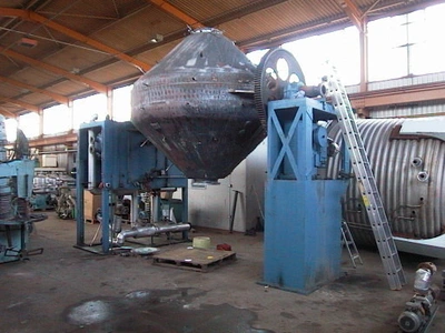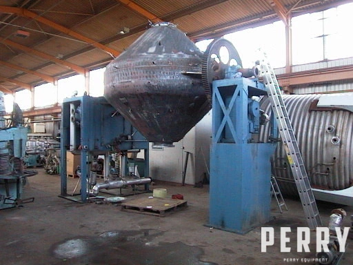 Perry is offering a used Henkhaus 321 stainless steel double cone vacuum dryer. Henkhaus is a leading manufacturer of drying equipment. This unit has an 8000 litre (282 cubic foot ) total capacity. Unit measures approx 2700mm diameter X 630mm straight side X 1100mm long cones. Internal rated full vacuum at 250°C. Unit includes internal vacuum tube. Has mild steel jacket rated 2.5 bar pressure at 250°C. Unit also includes (2) mounting plinths. Second plinth contains PIV drive rated 1440rpm input, 1.73/1 ratio, 830rpm output & 153.8 ratio, 11.5 – 2.55rpm. Electric motor rated 5.5 kW, 380 volt, 3/50, 1450 rpm. Unit also includes Leybold-Heraeus vacuum pump, KAT 11640, FAB no. 08022018, driven by 4 kW, 220/380 volt, 3/50, 2870 rpm motor, also with Pompe Cucchi pump. Also associated is 1 off used approx 3600 litre stainless steel tank. Approximately 2000mm diameter X 1250mm straight side X 500mm cone length. Has bolted flat top with quarter hinged lid and welded cone bottom. Unit is mounted on (3) lugs. Perry has been supplying this type of equipment for decades. You can rely on getting a first class service from the Perry Equipment Group.