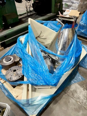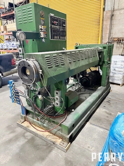 Used 3.5″ 24/1 L/D HPM non-vented extruder. Model 3.5TMC-24, serial #93182. New 1994. Has electrically heated, air-cooled, barrel. Belt driven by a 75 hp brushless DC motor with controls. Flender gearbox type SZNE-250 with a reduction ratio of approximately 13.88/1 rated for up 157 hp. Includes unitized temperature control panel, (1) spare screw, and Witlock dryer.