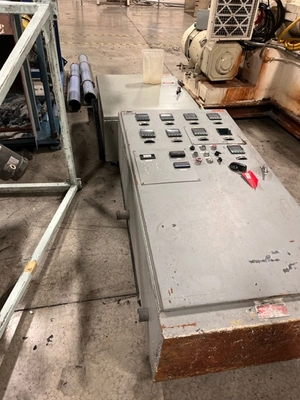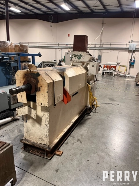 3.5″ Sterling 24/1 L/D ram feed assisted single screw non-vented extruder, Model #35754. Has electrically heated water cooled barrel and driven by a 125 hp dc motor with SCR control and temperature control panel. Includes 6″ screen changer and NGR underwater pelletizer.
