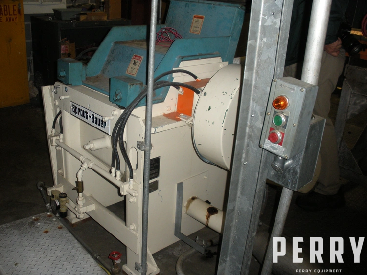 Andritz Sprout-Bauer Model DSF1518 granulator, 7-knife rotor, 2 bed knife, 30 HP 460 volt only motor, belt drive, 5″ X 18″ blow-in in-feed hopper, vacuum take-off discharge, mounted on a short leg base, no starter/controls designed for film granulation (3 available). Previously used for recycling polyester film edge trim.