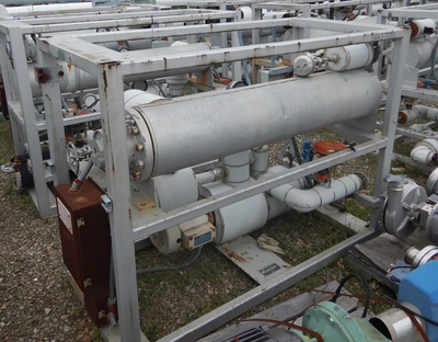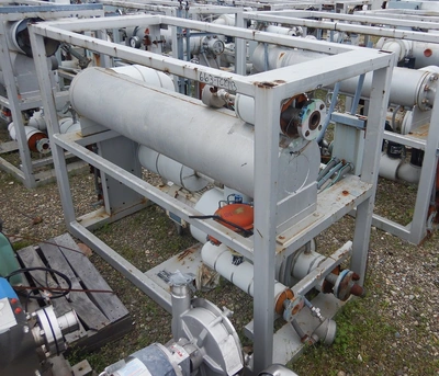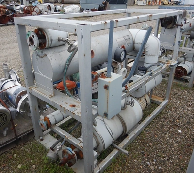 Used 30 kW Industrial Engineering Equipment Syltherm temperature control unit. 5 HP 480 volt, 30 kW, 450°F. Heat exchanger 150 psi at 450°F; 150 psi at -100°F. Catalog no. 359X-0557, identification no. C-91. Herzog hart corp Engineering model# IE 30/30L, S/N 10017, tag #-hr-5102, heat exchanger NB 935.