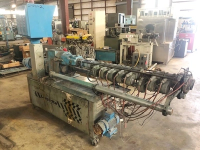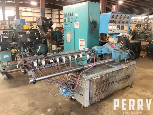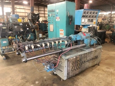 Used 30mm Leistritz counter-rotating twin screw extruder, 42/1 L/D vented barrel. New 1987. Has 11kw motor, 2200 rpm, 422 volt input. Gearbox rated at 13.5kw at 60hz. Barrel is electrically heated and air cooled and includes operator control panel.