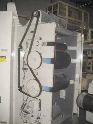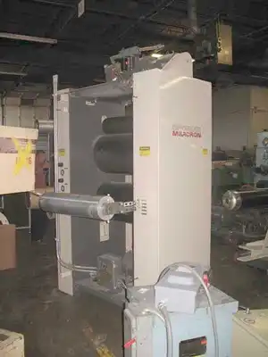 Has (2) rubber coated pull station, 18″ diameter X 34″ wide. Pneumatically operated and driven by same motor as above chrome rolls. Includes unwind stand for 40″ diameter rolls.