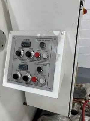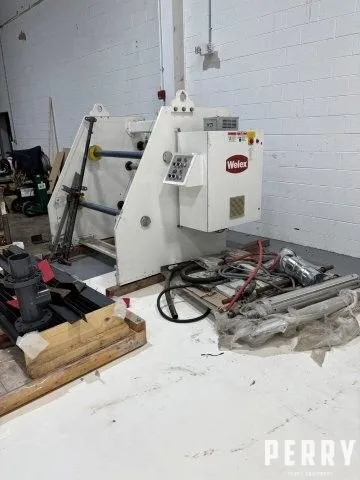 Used Welex two-position winder. Both positions are fixed and include 3″ air shafts for approximately 36″ OD finished rolls.