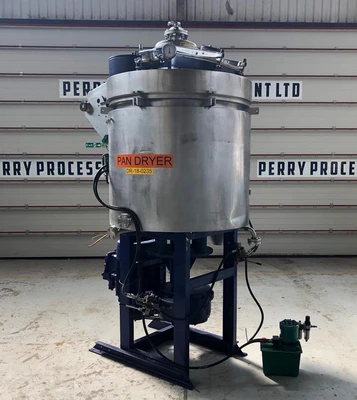 Used Guedu model 820 2V/PO stainless steel vacuum pan dryer. Pan approximately 1080mm diameter x 930mm deep. Approximately 500 litre working capacity and 820 litre total capacity. Has welded flat bottom and clamped dished top heads. Hydraulically operated lid and discharge valve. Has stainless steel heating jacket. ‘S’ curve agitator belt driven by 24/15 kw 380 volt 3/50 1465/730 rpm motor and gearbox. Mounted on stand.
