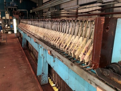 Used Edwards & Jones approximately 445 sqmt polypropylene plate filter press. Unit has (100) 1,500mm x 1,500mm recessed filter plates with approximately 50mm cake thickness. Has centre feed position with 7 bar feed pressure and (4) corner eye drainage. Has electrically operated open / closure driven by 18.5kw motor. Includes plate separation system driven by 2.2kw motor. Unit has mild steel frame.
