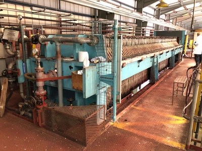 Used Edwards & Jones approximately 445 sqmt polypropylene plate filter press. Unit has (100) 1,500mm x 1,500mm recessed filter plates with approximately 50mm cake thickness. Has centre feed position with 7 bar feed pressure and (4) corner eye drainage. Has electrically operated open / closure driven by 18.5kw motor. Includes plate separation system driven by 2.2kw motor. Unit has mild steel frame.