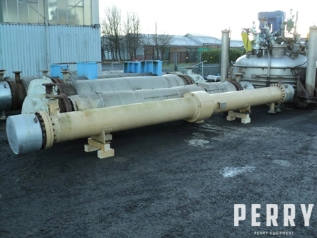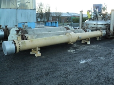 Used Johnson Hunt approximately 46.5SQMT 304L stainless steel tube and carbon steel shell horizontal heat EXCHANGER. Has (128) approximately 19mm outside diameter X 6096mm long stainless steel tubes 236 LITRE capacity rated 9.3 bar design pressure at 150 DEGC. Has carbon steel shell approximately 380mm diameter X 6007mm long 464 LITRE capacity rated 6.5 bar design pressure at 64 DEGC. Shell includes expansion bellows. Bolted stainless steel heads 8 pass design. Mounted on (2) cradles. Last used as waste water cooler.