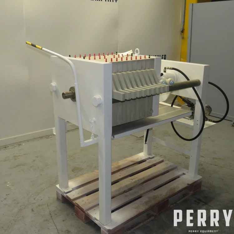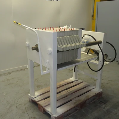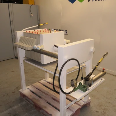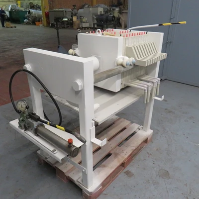 Used Filter press – 10 polypropylene trays 465 x 465 mm – Chambered trays – With hydraulic manuel pump