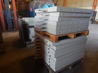 45 Unused Micronics JVK 15033 solid 1200mm x 1200mm polypropylene, 3″ thick 4-eye delivery plates. $650.00 each