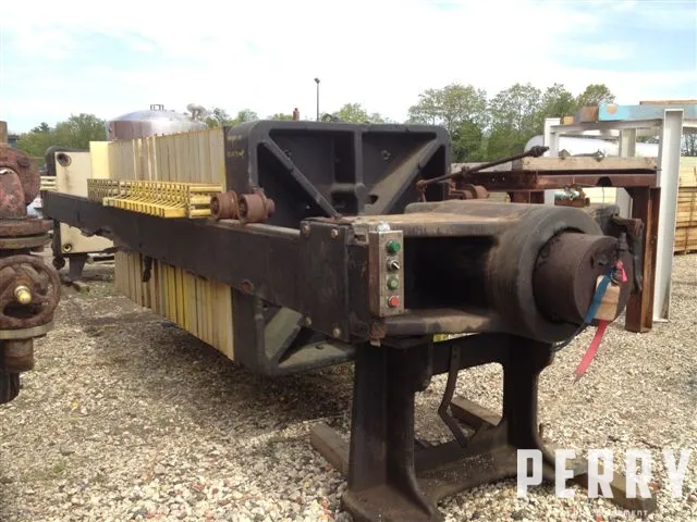 Used filter press. (62) 1200mm polypropylene recessed Lenser plates. 4-eye. Shriver skeleton. Hydraulic closure.