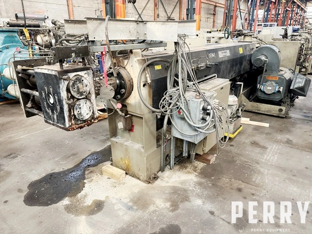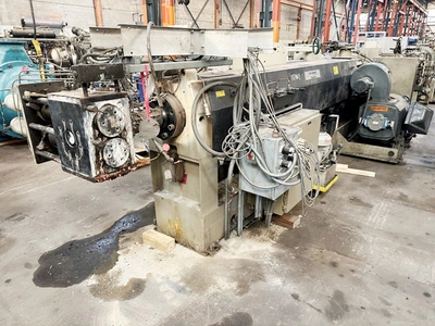 Used 130mm (5.11″) 30/1 L/D Non-Vented Davis Standard Extruder. Driven by 250 hp DC motor with 42″ centerline air cooled barrel. Includes heat panel (without temperature controller), SCR controller and 6″ continuous screen changer with Hyd pump. Gearbox is Serial #14844, SO #70693, rated at 365 hp with 1.5″ service factor, 17.49/1 gear ratio. New 12/2000. 42″ barrel centerline height.