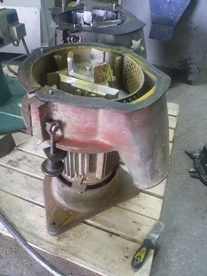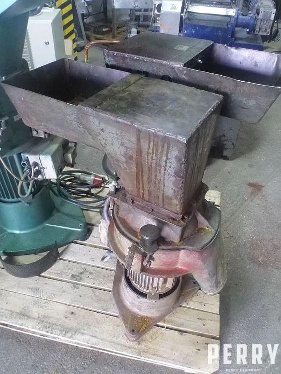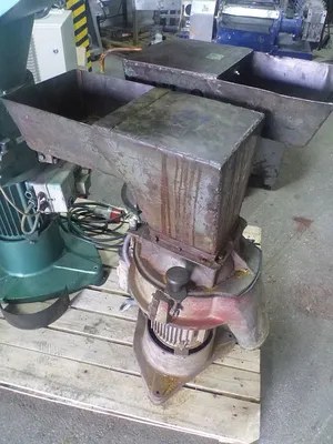 Used vertical plastic cutter polish made. Machine is driven by electric motor with power 4 kW, 1440 rpm, 50 Hz, 220/380V. Inlet dimensions: width 270 mm x 140 mm height. Milling chamber has a internal diameter 275 mm. Rotor has 3 knives. On milling chamber walls are mounted 3 static knives. Bottom side discharge. Dimensions: 800 mm x 400 mm x 950 mm.