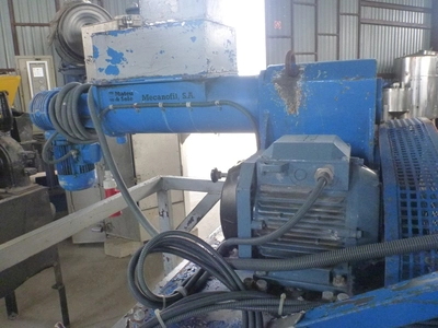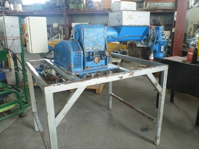 Used carbon steel cutter for plastics made by Mecanofil (Spain) with feeder screw conveyor. Screw feeder conveyor driven by 0,55 kW motor via bevel gearbox. Grinding chamber dimnesions: length 250 mm x diameter 170 mm. Has 2 static blades and screen perforation 6 mm. Rotor with 4 blades is driven by belt gearbox and elec. Motor 4 kW. Mounted on carbon steel frame. Includes control panel. Shipping dimensions: width 1200 mm x depth 1800 mm, height 1900 mm. No documentation. Weight: 720 kg. New 1999. No technical documentation.