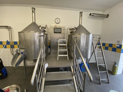 Used beer brewery system (block brewery) with total volume 550 litre and nominal volume 500 litre. Brewery is designed as a block connected to stainless steel frame and steps. Unit is consist of: