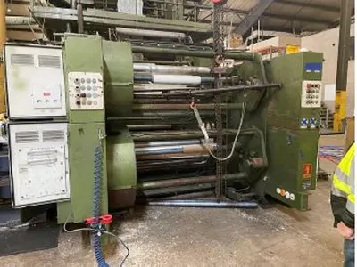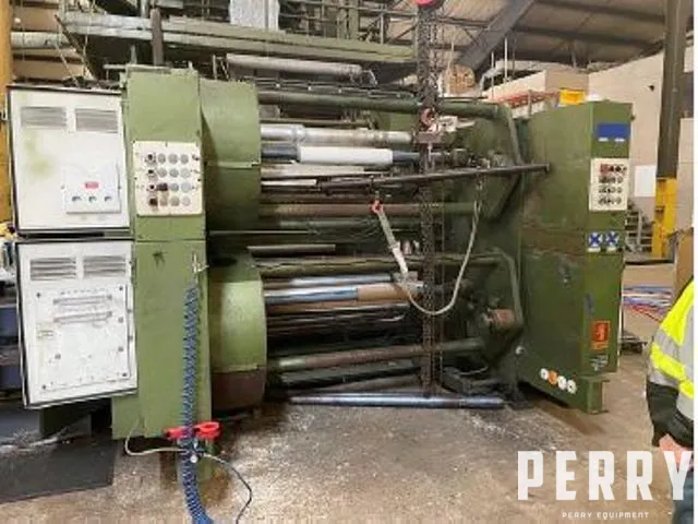 Used 54″ wide Gloucester dual turret winder. Model 1001D, serial #31196-46. Good for 30″ diameter rolls. Has 3″ shafts, auto cut (in both directions on bottom turret, in one direction on top turret).