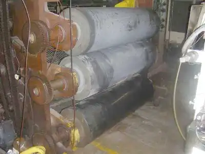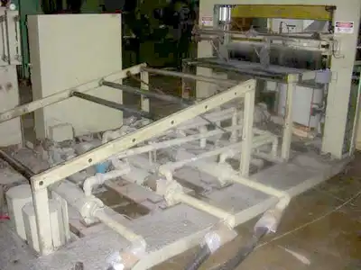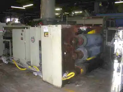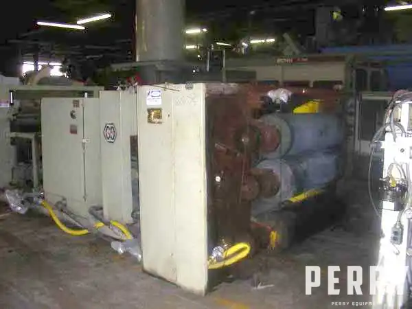 Used Marshall and Williams sheet take-off unit consisting of (3) 54″ face rolls mounted in a vertical arrangement for a downstack operation. All three rolls measure 16″ in diameter and are ceramic coated. Top and bottom rolls are air actuated. Rolls are driven via silent chain and sprocket by a DC motor through a gearbox. Unit has a three-zone built-onto-frame temperature control system with three pumps, three heaters, and six heat exchangers. Included is an idler roll conveyor between the cooling and polishing stand and pull rolls with razor slitting station. Pull rolls measure 54″ face X 8″ diameter and are rubber covered. Top roll is air actuated. Pull rolls are driven by a DC motor through a gearbox. Serial #4885. S.O.#27223, MSO #27221.
