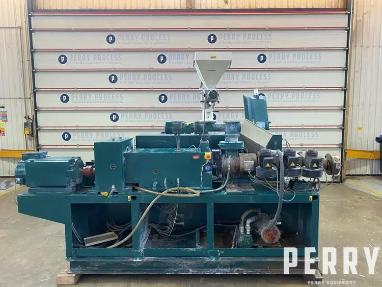 Used Battenfeld-Cincinnati model CM55 counter rotating approximately 55mm diameter twin screw extruder. Conical screw design. Barrel is electrically heated and air cooled in three zones with air blowers with 0.20kw motors. Unit is driven by 37 to 49.5kw, 350 to 493 volt, 50.8 to 74.2 hz, 1500 to 2200rpm electric motor with gearbox. Unit has top entry Plasticolor 2500 vibratory feeder with horizontal screw feeder driven by 0.55kw. Unit includes touchscreen controls.
