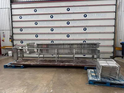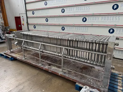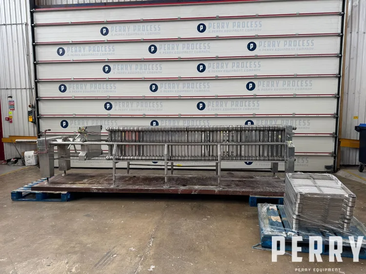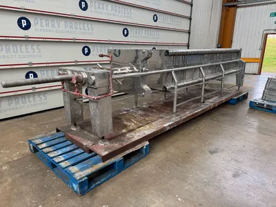 Used Carlson stainless steel plate & frame filter press. Unit has (54) stainless steel perforated plates which measure approximately 560mm x 560mm giving a total filtration area of 33.8sqmt. Unit has (52) stainless steel frames. Includes manual hydraulic open and closure device. Unit is mounted on legs with a mild steel base.