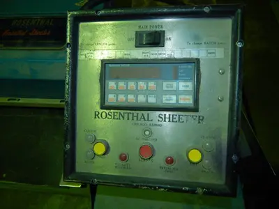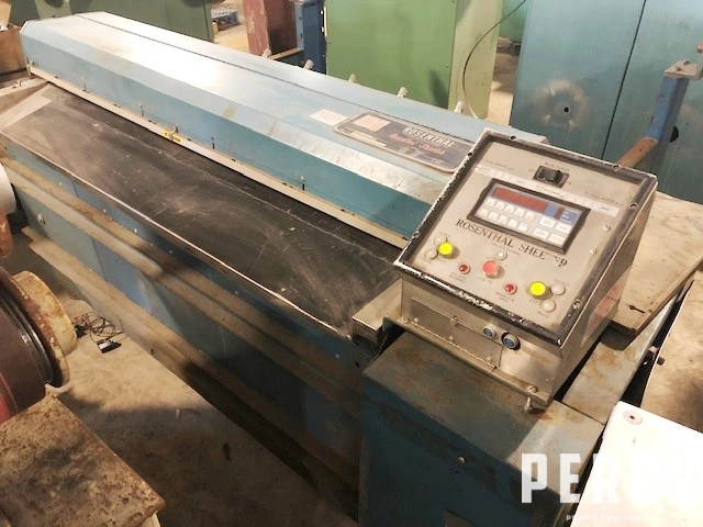 Used 60″ Rosenthal sheeter, model #WA-S-5-HUBSEVAAW, heavy duty blade, dual 48″ O.D. Unwinds with tension assembly. With Idler rolls, static eliminators, variable speed motor.