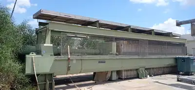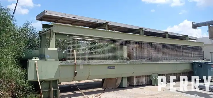 Used Diemme model MEGAS 1500-2000 approximately 600 sqmt polypropylene plate filter press. Unit has (100) 1,500mm x 2,000mm polypropylene plates. Unit has mild steel frame. Unit includes hydraulic open/closure drive with compression pressure rated 15 bar. Approximately 12 ton dry sludge capacity. Unit includes control panel. Approximate overall dimensions: 13.5m long x 3.3m wide x 3.7m high.
