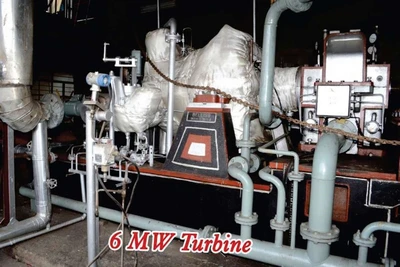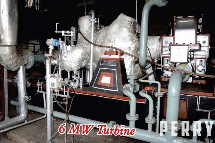 – Belliss India Ltd (India) model HEN-22 extraction condensing steam turbine, new in 2000, has capacity 6,000 kW, inlet steam pressure 44 kg/cm2 @ 420 Deg.C., with extraction/bleed capacity 11 tph at pressure 7 kg/cm2. Includes Triveni Engeneering Ltd (Mysore) gearbox, coupled on common baseframe, input speed 8600 rpm and rate 5.76/1 which gives output speed 1500 rpm,