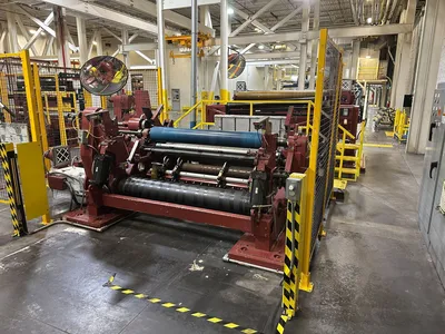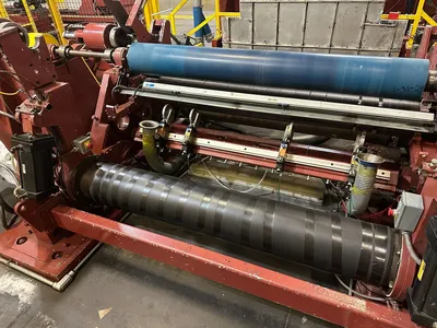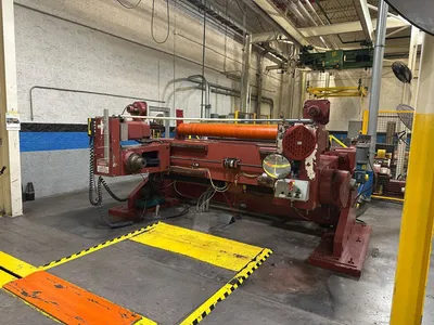 Equipped with 60 HP variable speed DC drive system, 75″ wide × 48″ maximum diameter single-spindle unwind stand, Fife web guide unit, (2) shaft extractors, control panel, and pit-mounted hydraulic scissor lift table.