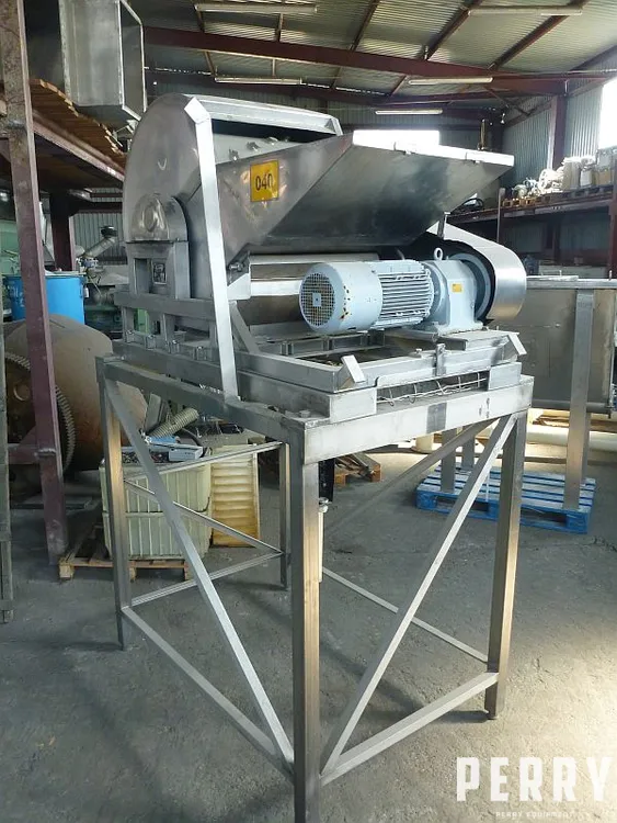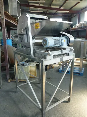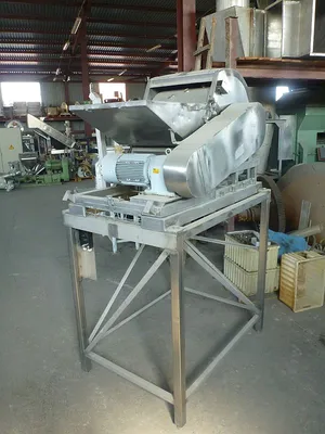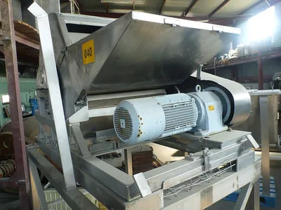 Used stainless steel single shaft shredder by Wolf (Germany) type WZA 3000. Shredder has a single shaft with a width 580 mm x diameter 600 mm. Shaft is belt driven by 5.5 kW, 1430 rpm, 380-415 V, 50 hz. Working rotation on shaft is 293 rpm. Shaft has 4 rows of welded knives, each row has a 5 knives. Also there is a row of static 10 knives. Machine has a feeding inlet with dimensions 615 mm width x 500 mm height. Machine is mounted on stainless steel supporting frame. Bottom discharge. Machine had been working in food industry.