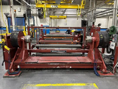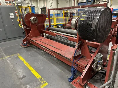 Includes 30 HP variable speed DC drive system, 72″ wide × 60″ (152 cm) maximum diameter single-spindle unwind stand, and pit-mounted hydraulic scissor lift tables.