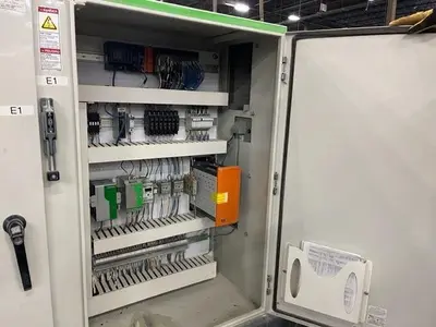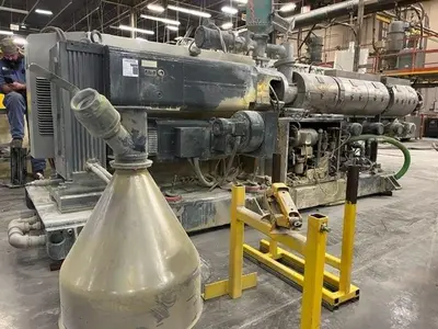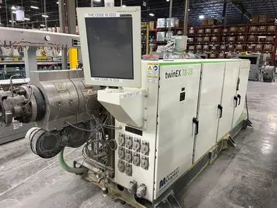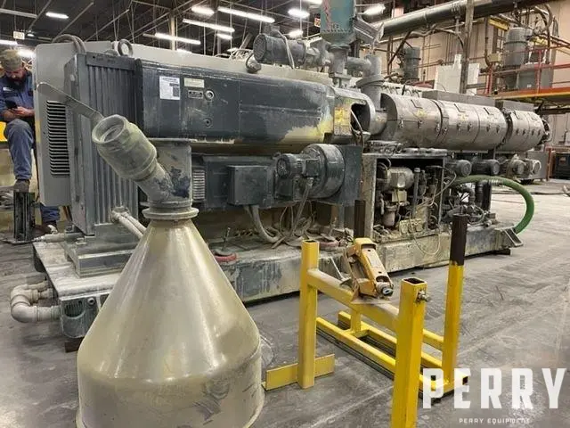 Used 78mm American Maplan counter-rotating twin screw extruder, new 2015. Has (4) blowers for air cooling on the barrel, oil heated screws, includes hopper with power feeder and hopper magnet. Driven by 56kw motor through Eisenbeiss reducer. Includes temperature control panel with (9) zones. Overall dimensions 15′ long x 5′ wide.
